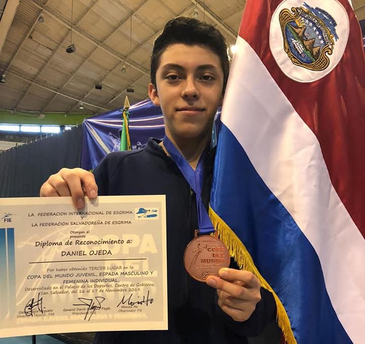 Nombre: Daniel Ojeda Butriago Lugar y fecha de nacimiento: San José Costa Rica, 15 de octubre del 2004 Club al que pertenece: club de esgrima San José Peso: 75 kg Estatura: 1.73 mts Arma: Espada Orientación: Diestro Sonriente como cada vez que entra a una sala de armas y sube a las pedanas, así nos