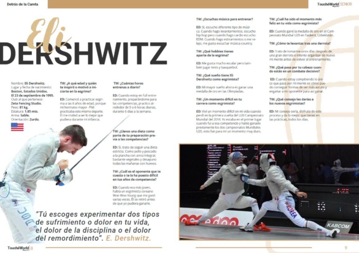 En esta ocasión recordamos la entrevista realizada al sablista Eli Dershwitz, tres veces ganador de los Juegos Panamericanos, además de ser campeón mundial individual en 2023 en Milán. Nombre: Eli Dershwitz. Lugar y fecha de nacimiento: Boston, Estados Unidos. El 23 de septiembre de 1995. Club al que pertenece: Zeta Fencing Studio. Peso: 81 kg.